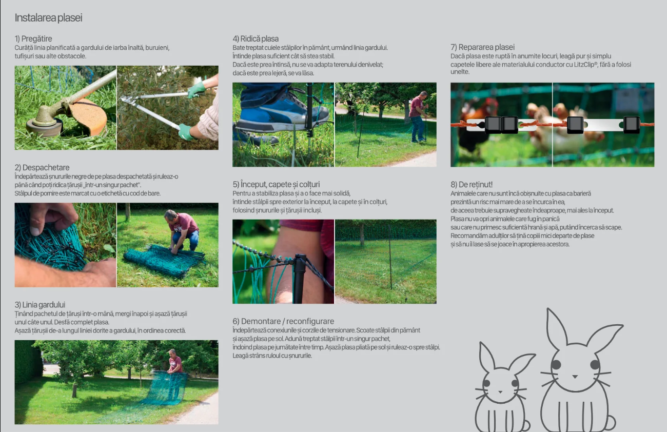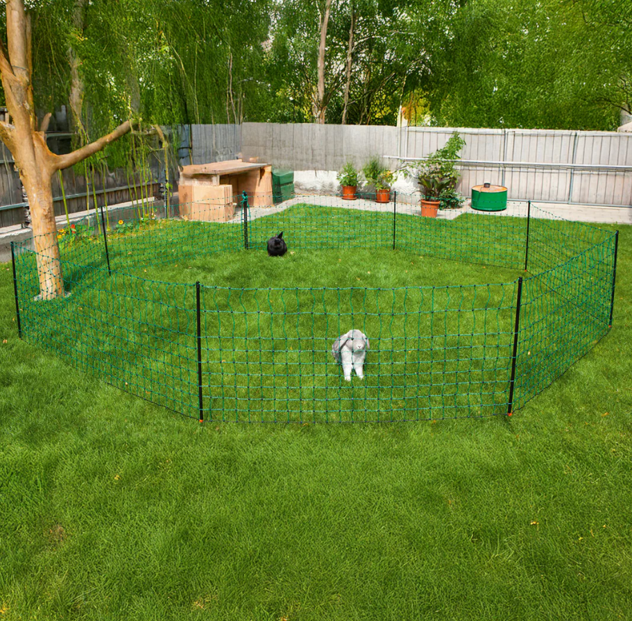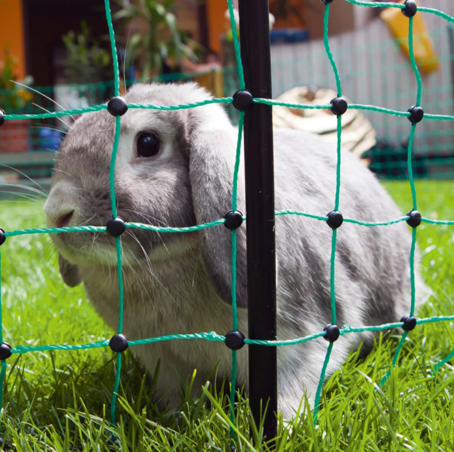Gard electric mobil cu ochiuri extra-dese, protecție sigură pentru iepuri și animale mici. Instalare rapidă cu stâlpi integrați.