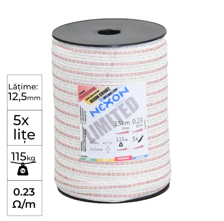 200 metri de banda pentru gard electric de foarte buna calitate, foarte masiv si gros. Recomandat si pentru terenuri agrabatice, pentru animale salbatice si domestice.