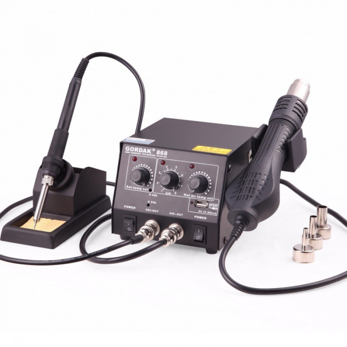Statia de lipit cu aer cald si letcon Gordak 868, termocompensata, pentru profesioniști dar si pentru pasionații de electronică, este usor de utilizat și foarte eficientă. Principalele avantaje ale seriei 868 sunt marimea redusa, zgomot mai mic si interfata USB.