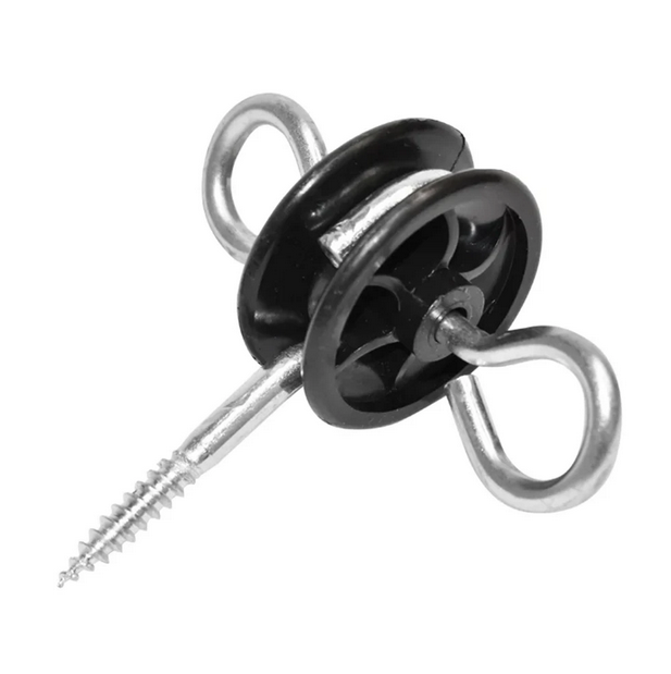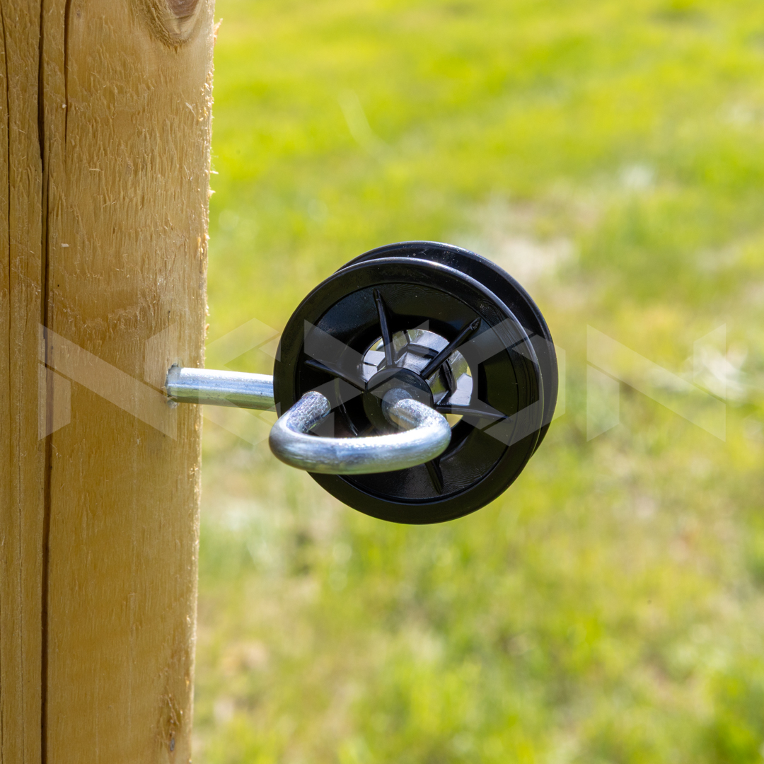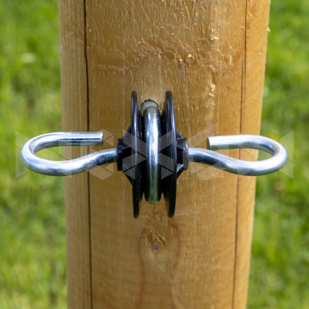 Izolator dublu extra-solid, proiectat pentru fixarea stabilă a mânerelor de poartă electrificate (cârlig și/sau buclă) pe stâlpi din lemn. Oferă izolație sigură, rezistență mecanică ridicată și durabilitate optimă în utilizare zilnică la exterior.