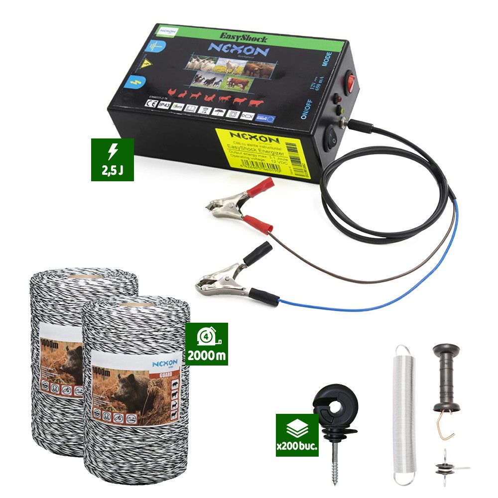 - Un pulsator electric de 2,5J putere (cu Buton de oprire/pornire și Buton reglaj tensiune + 2 LED-uri indicator stare baterie și starea Gardului)