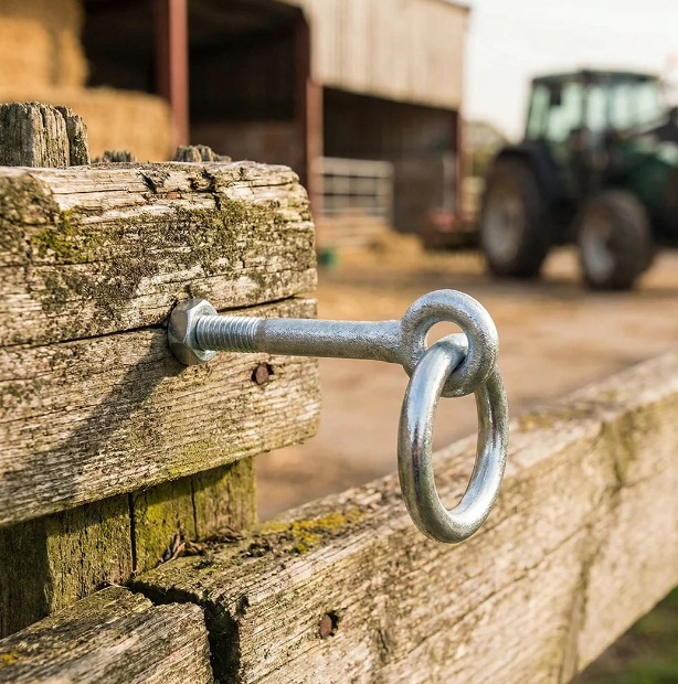 Inelul de prindere cu șurub filetat este un element de fixare robust, utilizat pentru ancorare, prindere și suspendare în diverse aplicații din agricultură, construcții sau industrie. Designul cu filet permite montarea rapidă în suporturi din lemn sau alte materiale compatibile, oferind o fixare sigură și stabilă.