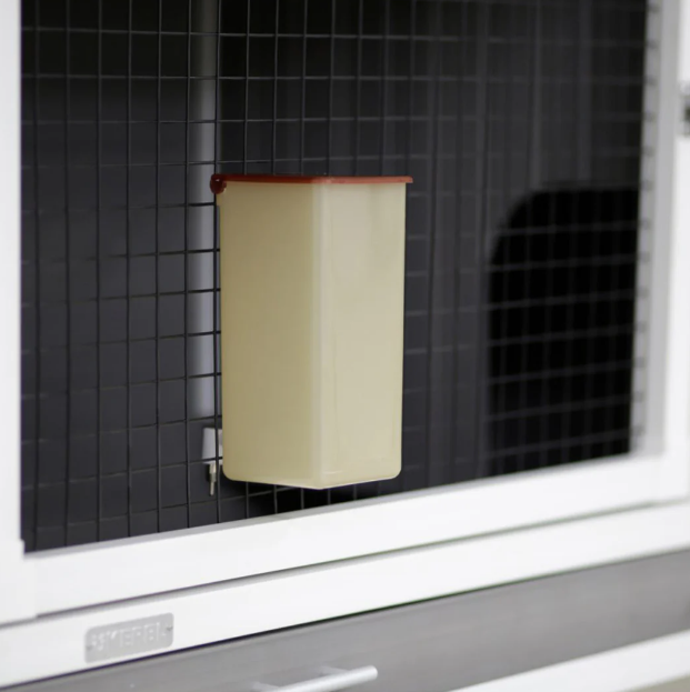 Recipientul este realizat din plastic durabil, iar montarea se face rapid pe cușcă, atât în interior, cât și în exterior. Capacul protector previne pătrunderea impurităților, menținând apa curată pentru mai mult timp.