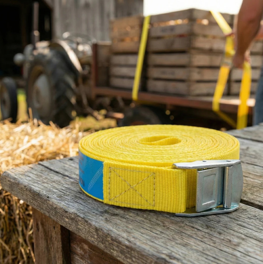 Culoarea galbenă asigură vizibilitate excelentă, iar catarama metalică robustă permite tensionarea rapidă și fixarea fermă a încărcăturii.